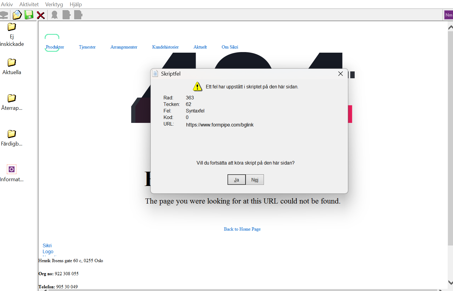 Om ni får upp felkod/popup liknande nedan, antingen “kryssa” ner den eller välj nej för att komma vidare så kan ni använda programmet medan vi felsöker samt åtgärdar problemet!